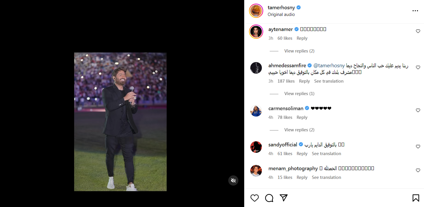 كما علق بعض مشاهير ونجوم الفن علي الفيديو الخاص به، معبرين عن سعادتهم بالحفل، ومنهم :"أيتن عامر، أحمد عصام الذي أشاد بصديقه تامر حسني قائلا "ربنا يديم عليك حب الناس والنجاح ديما مشرف بلدك في كل مكان بالتوفيق ديما اخويا حبيبي، كما علقت ساندي "بالتوفيق الدايم يارب".