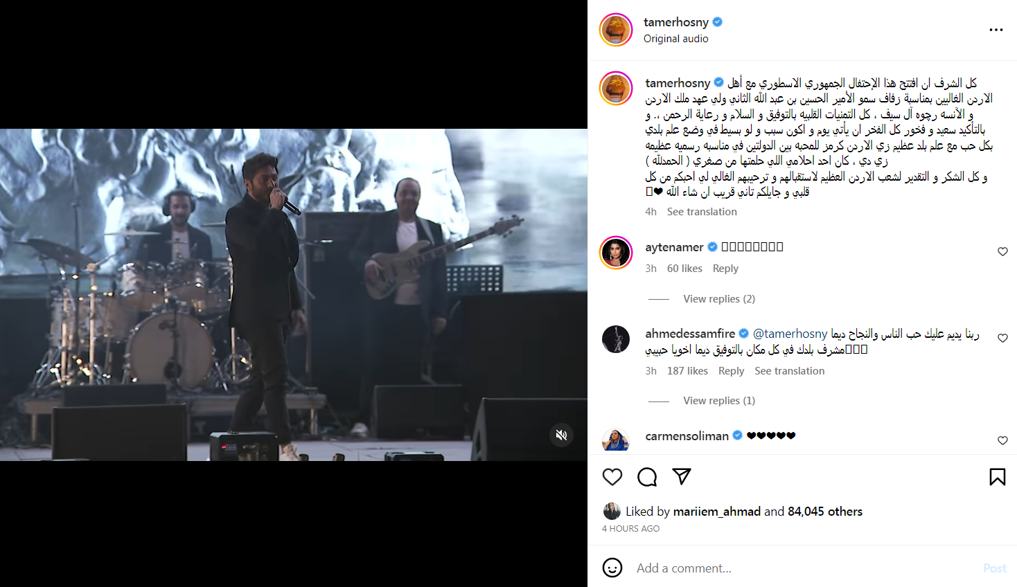 أشار تامر حسني على الفيديو معلقا:"كل الشرف أن افتتح هذا الإحتفال الجمهوري الاسطوري، مع أهل الاردن الغاليين، بمناسبة زفاف سمو الأمير الحسين بن عبدالله الثاني ولي عهد ملك الاردن، والآنسه رچوه آل سيف، كل التمنيات القلبيه بالتوفيق والسلام ورعاية الرحمن".