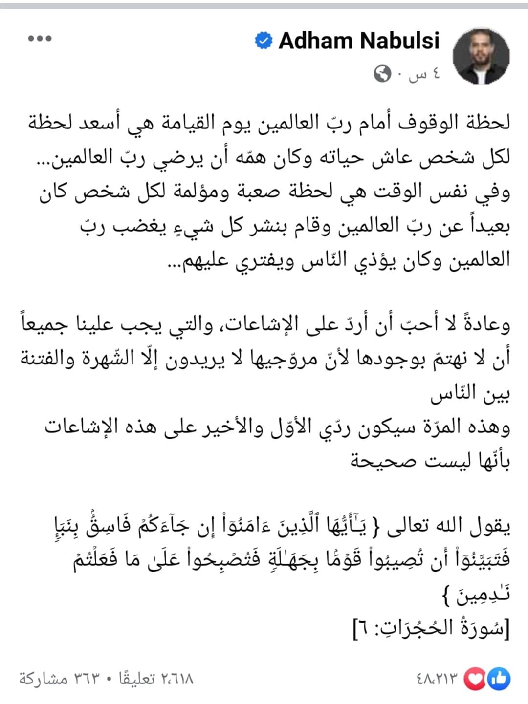 واستشهد أدهم نابلسي بآية قرآنية قائلًا: يقول الله تعالى { یَـٰۤأَیُّهَا ٱلَّذِینَ ءَامَنُوۤا۟ إِن جَاۤءَكُمۡ فَاسِقُۢ بِنَبَإࣲ فَتَبَیَّنُوۤا۟ أَن تُصِیبُوا۟ قَوۡمَۢا بِجَهَـٰلَةࣲ فَتُصۡبِحُوا۟ عَلَىٰ مَا فَعَلۡتُمۡ نَـٰدِمِینَ }.
