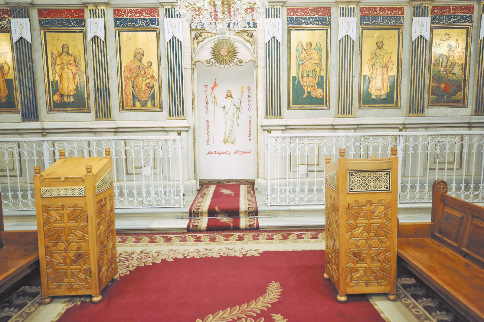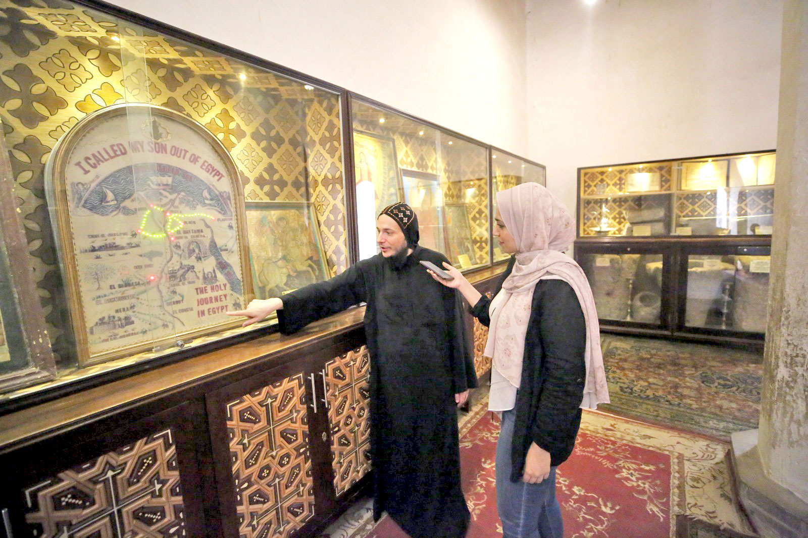 يجوب بنا الراهب لعازر فى الدير ويحدثنا عن الأيقونات التى تُزين حوائط الكنيسة وتأتى فى مدخل الكنيسة من جهة اليمين «أيقونة العذراء القروية» تبدو أم المسيح بزى وملامح سيدة من الريف المصرى، وتسير على جنبات الكنيسة تجد أيقونات للعذراء تحتضن المسيح مرسومة وفق ثقافات متنوعة وأيقونات للقديسين والهروب الشهيرة وأيقونة مجمعة لمسار العائلة المقدسة.