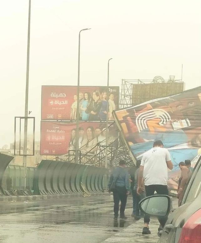 دفعت الإدارة العامة لمرور القاهرة الأوناش لرفع لافتة الإعلانات التي سقطت أعلى مناطق رمسيس في اتجاه مدينة نصر نتيجة للرياح القوية والأحوال الجوية السيئة التي شهدتها البلاد خلال الدقائق الماضية، حيث تلقت الأجهزة الأمنية بمديرية أمن القاهرة، إخطارًا من غرفة عمليات النجدة يفيد بسقوط لوحة إعلانات ضخمة أعلى كوبري أكتوبر.