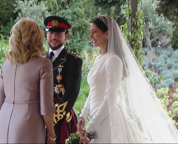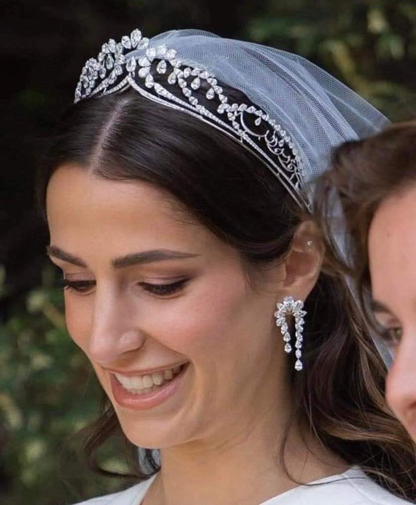 وشبه البعض تاجها بتاج الملكة رانيا التي ارتدته في الإطلالة الثانية من حفل الزفاف، إذ أهداها الملك عبدالله الثاني هذا التاج عام 2005، ويعد من التيجان المشغولة بحرفية وجودة عالية، يحمل معانٍ كبيرة خصوصًا أنه مشغول بالأحرف العربية وهذا أمر غير مسبوق في التيجان الملكية، ومزين بالخط العربي بعبارة "لله العظمة".