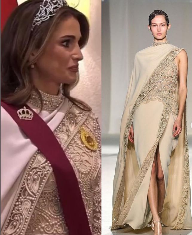 وجاءت إطلالة الملكة رانيا لتمزج بين الفخامة والاحتشام في آن واحد، حيث ارتدت فستان طويل مجسم، بأكمام طويلة، واتسم بكاب من ناحية الكتف، وطرز بالخيوط من ناحية الصدر وعلى لياقته، باللون الأبيض الكريمي، صمم الفستان خصيصًَا لها عدل ليتناسب مع احتشامها وحمل توقيع مصمم الأزياء اللبناني العالمي إيلي صعب، وينتمى من لمجموعة ربيع و صيف ٢٠٢٣ .