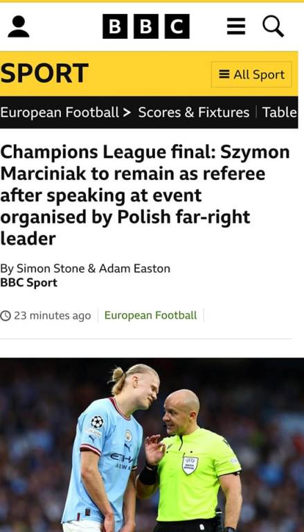 سيبقى سيمون مارسينياك حكم نهائي بطولة دوري أبطال أوروبا لموسم 2022 ـ 2023، بعد أن اعتذر عن حديثه في حدث نظمه زعيم اليمين المتطرف البولندي سلاومير مينتزن.