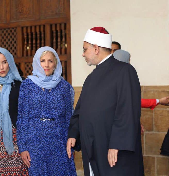 وأظهرت الصور التي نشرها الأزهر الشريف، من زيارة جيل بايدن للجامع الأزهر، سيدة أمريكا الأولى وهى تضع غطاء الرأس احترامًا للتقاليد الإسلامية.