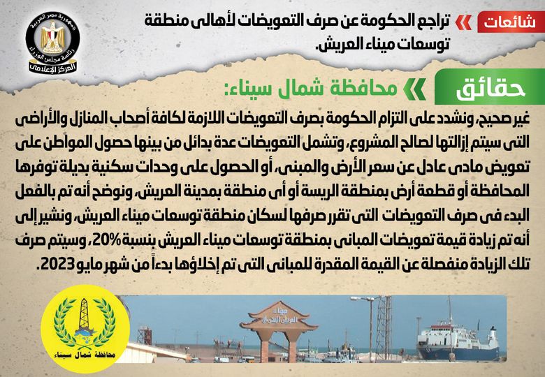 وقام المركز الإعلامي لمجلس الوزراء بالتواصل مع محافظة شمال سيناء، والتي نفت تلك الأنباء، مُؤكدةً أنه لا صحة للتراجع عن صرف التعويضات لأهالي منطقة توسعات ميناء العريش، مُشددةً على التزام الحكومة بصرف التعويضات اللازمة لأصحاب المنازل والأراضي كافة التي سيتم إزالتها لصالح المشروع، وتشمل التعويضات بدائل عدة من بينها حصول المواطن على تعويض مادي عادل عن سعر الأرض والمبنى، أو الحصول على وحدات سكنية بديلة توفرها المحافظة، أو قطعة أرض بمنطقة الريسة، أو أي منطقة بمدينة العريش.