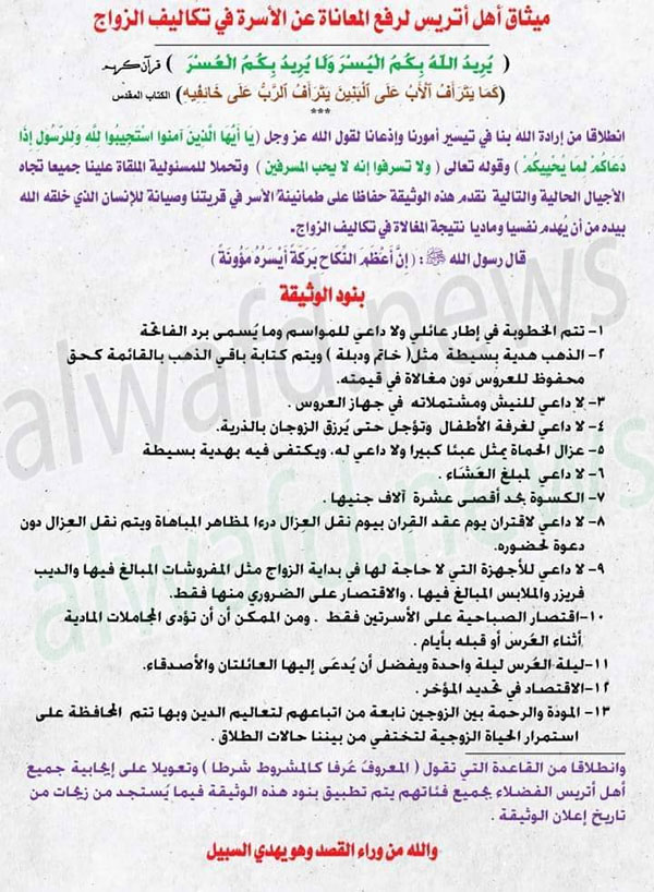 ووجد أبناء القرية في الندوة حلًا يُخلص المقبلين على الزواج من غلاء المهور والطلبات المبالغ فيها، من خلال وضع وثيقة تُعد بمثابة عُرف جديد داخل القرية، وتُحد من مسألة المغالاة في المتطلبات من ذهب وفرش وأثاث وغير ذلك.