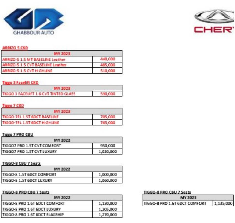 وشهدت قائمة أسعار سيارات شيري الصادرة عن مجموعة جي بي غبور أوتو، زيادات جديدة على أسعار سيارات شيري المجمعة محليًا فقط موديل 2023 وهى "أريزو 5 – تيجو 3 – تيجو 7" وثبات أسعار سيارات شيري المستوردة المتوافرة في السوق المصرية وهى “تيجو 7 برو – تيجو 8 – تيجو 8 برو”.