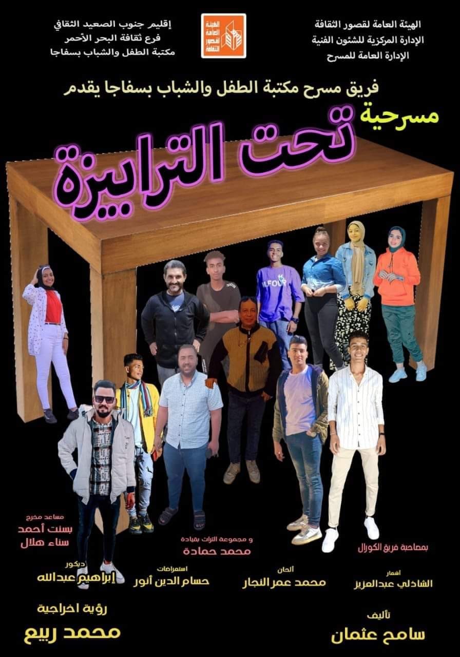 ويتناول العرض صراعا بين مجموعة من الشخصيات من الطبقة الفقيرة ولكل شخصية حكاية وتدور أحداث صراع بين هؤلاء الأشخاص من نفس الطبقة. والمسرحية فضاء مغاير وتجربة نوعية تحوي خلالها فرقتي كورال وتراث واستعراض اطفال. "تحت الترابيزة" تأليف سامح عثمان و ديكور إبراهيم عبد الله و أشعار الشاذلي عبد العزيز و ألحان محمد عمر النجار و استعراضات حسام الدين أنور و غناء تراث حمادة عزو و مساعد مخرج بسنت أحمد و سناء هلال ورؤية وإخراج محمد ربيع والعرض إنتاج الإدارة العامة للمسرح التابعة للإدارة المركزية للشئون الفنية برئاسة الفنان أحمد الشافعي وقدمها فرع ثقافة البحر الأحمر برئاسة سوسن عبد الرحيم ضمن عروض تجارب النوعية للمسرح بإقليم جنوب الصعيد الثقافي برئاسة عماد فتحي ضمن فعاليات الموسم المسرحي الحالي.