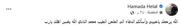 وكتب حمادة هلال عبر حسابه الرسمي بموقع التواصل الاجتماعي “فيسبوك”:" الله يرحمك ياحبيبي وأسألكم الدعاء الى الملحن الطيب محمد النادي الله يصبر اهلك يارب ".
