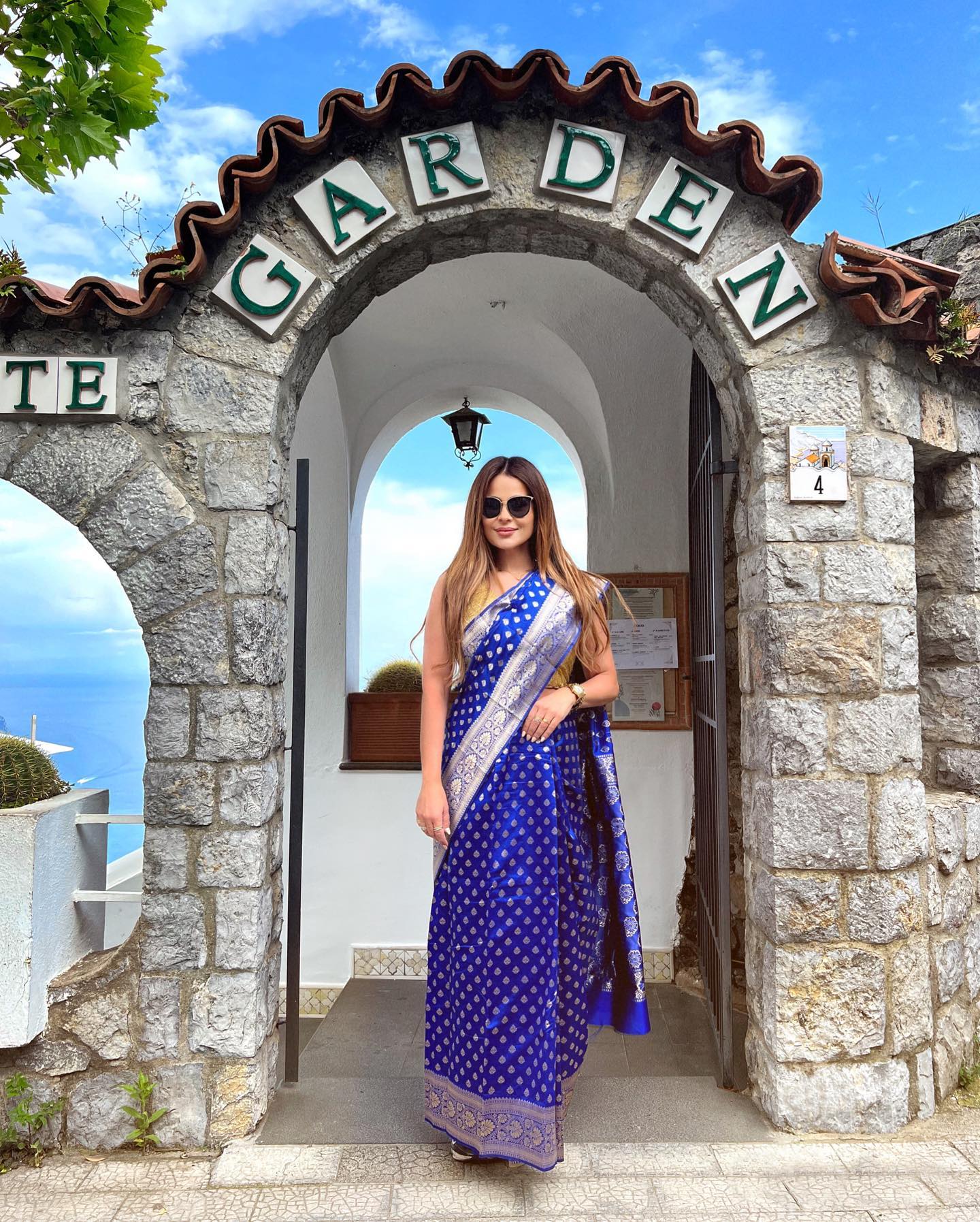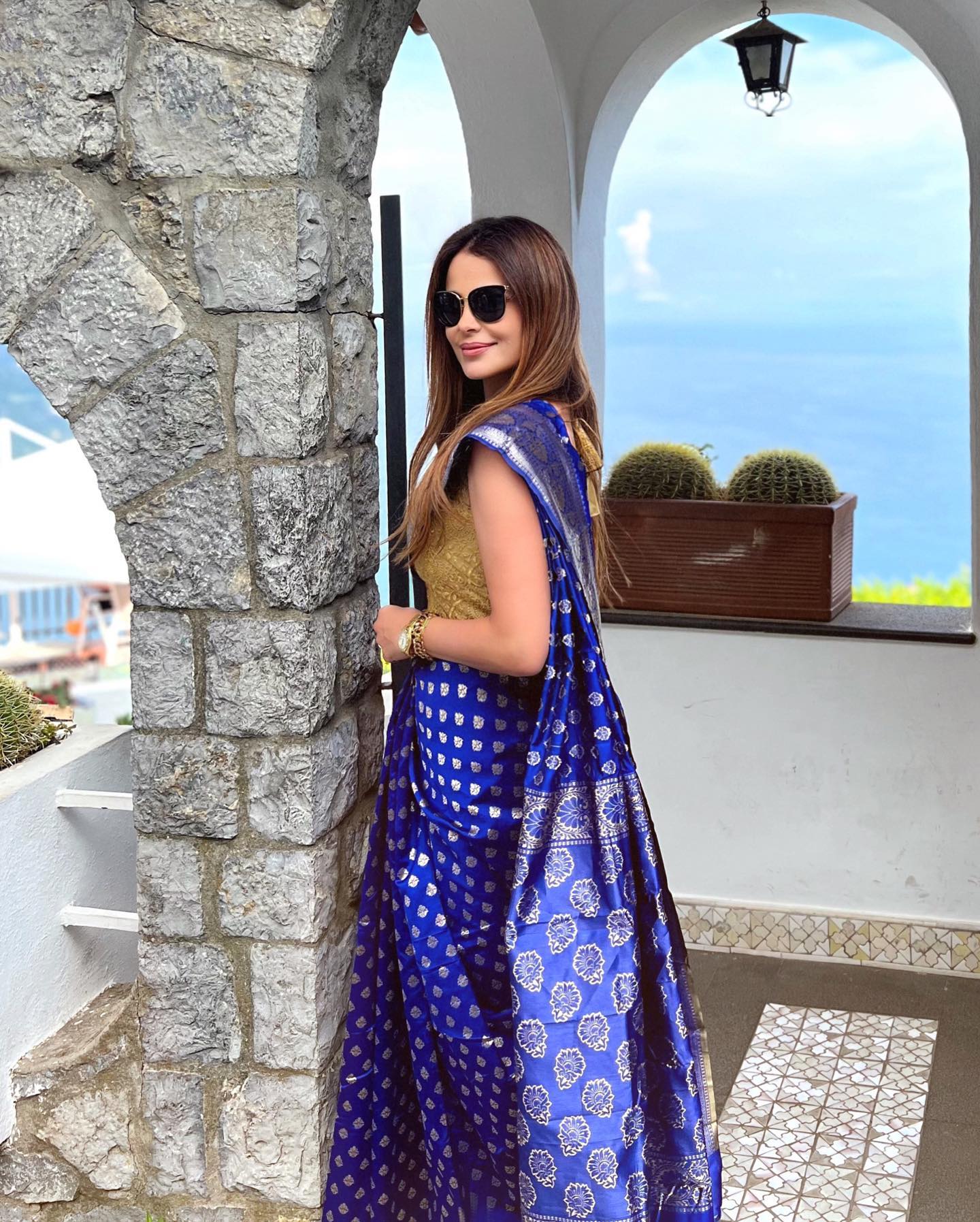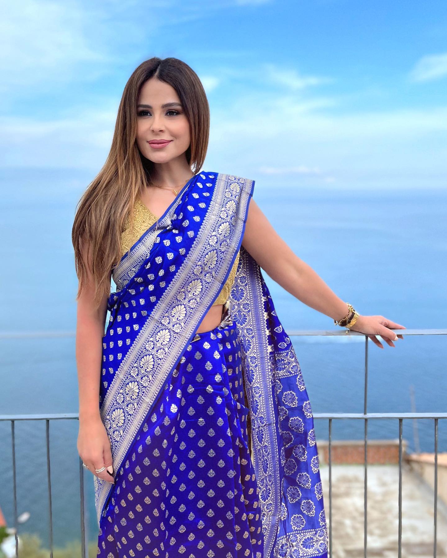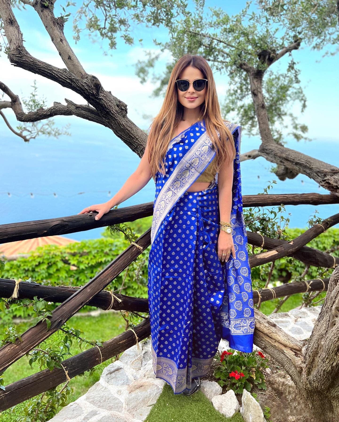 ظهرت الفنانة كارول سماحة بإطلالة جذابة ومثيرة، مرتدية ساري هندي باللون "الأزرق"، ونسقت معه توب ذهبي، مصمم من قماش بنقاشات مختلفة، أكملت اللوك بنظارة شمسية، مما أبرز جمالها وقوامها الممشوق.