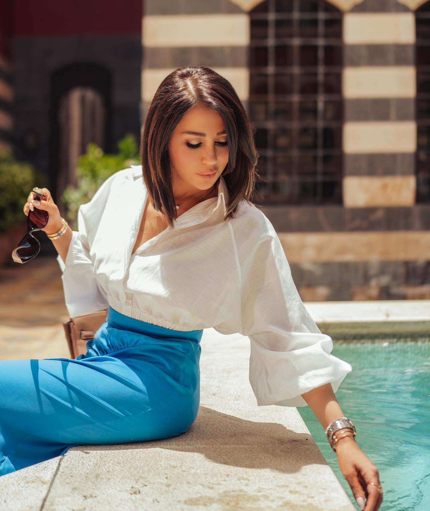 ظهرت الإعلامية رابعة الزيات بإطلالة جذابة ومثيرة، مرتدية جيب باللون "اللبني" ويتميز بفتحة في منطقة الساق، ونسقت معه بلوز أبيض بأكمام منفوشه، مصمم من قماش بدون نقاشات، أكملت اللوك بصندل كعب عالي ونظارة شمسية، مما أبرز جمالها وقوامها الممشوق.
