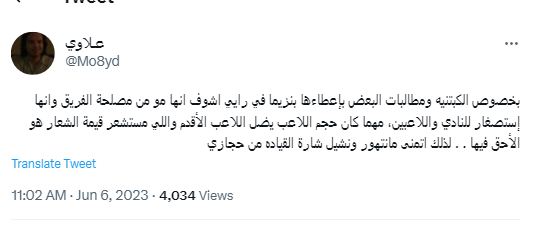 وبحسب ما قاله الزهراني، فإن نادي اتحاد جدة قرر سحب شارة القائد من أحمد حجازي مدافع منتخب مصر وقائد الفريق بالوقت الحالي، من أجل منحها إلى كريم بنزيما الوافد الجديد.