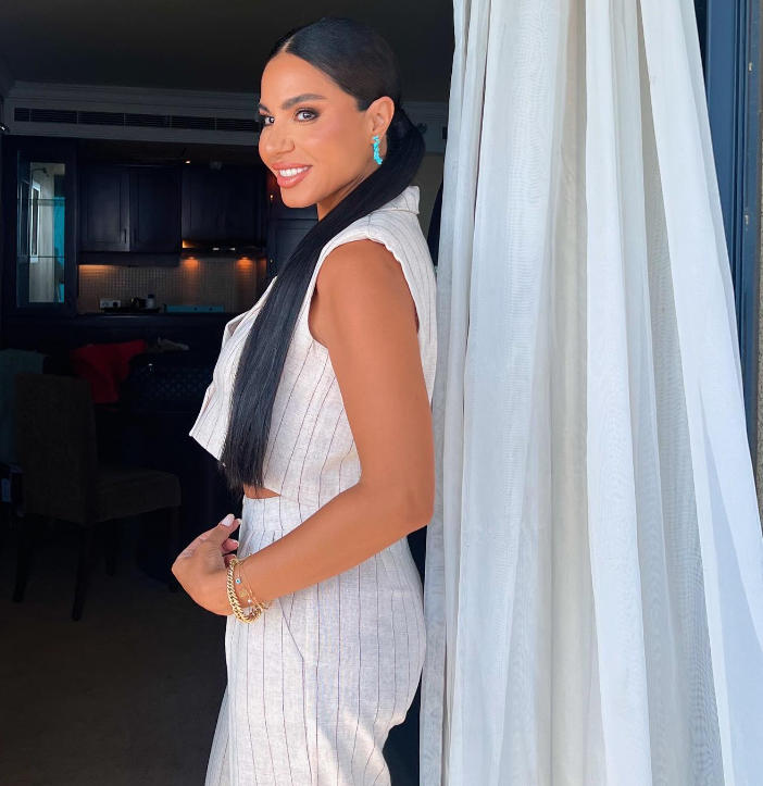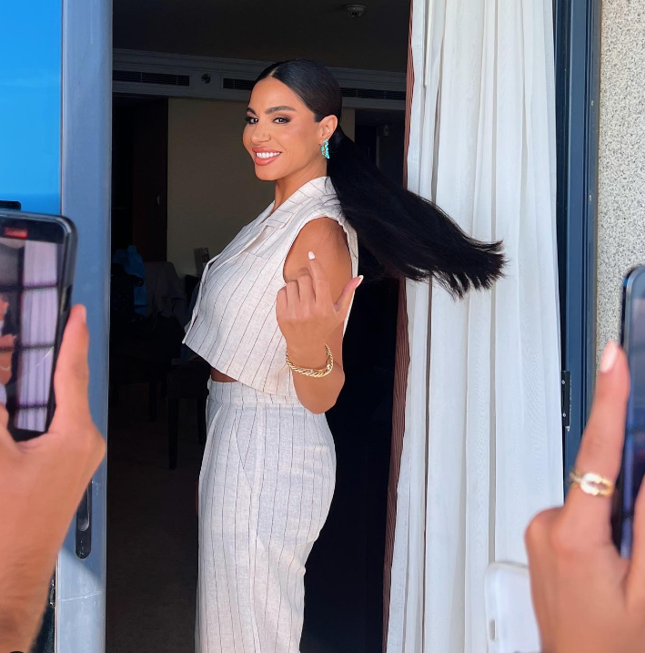 وتألقت نسرين أمين بإطلالة كاجوال جريئة، حيث ارتدت بدلة كلاسيك أنيقة باللون الأبيض المقلم، مكونة من بليزر قصير "هاف ستومك" مكشوف البطن والأكمام، وبنطلون فضفاض، مما أبرز أنوثتها وقوامها الرشيق الممشوق.د