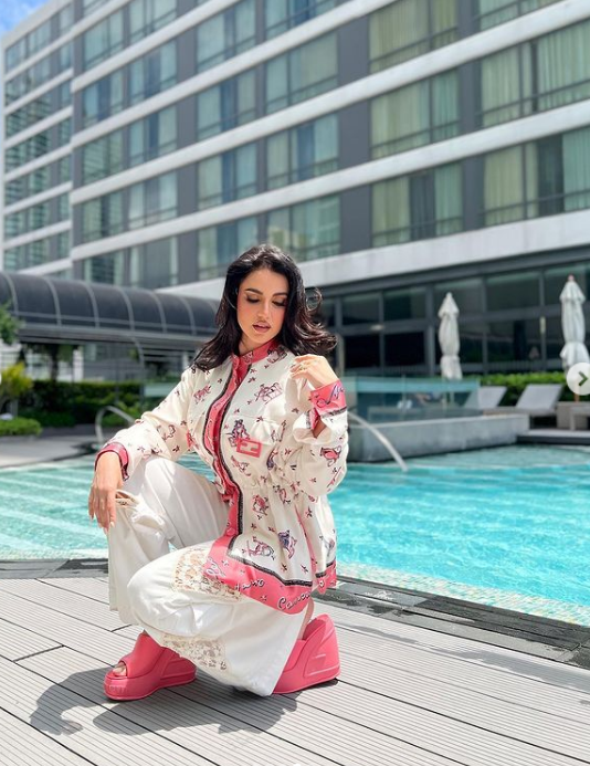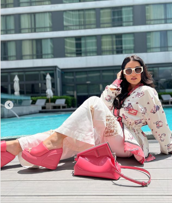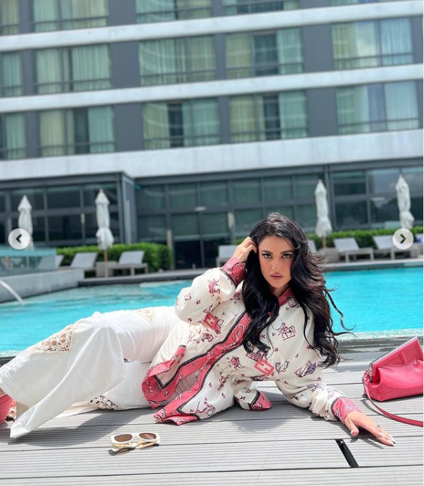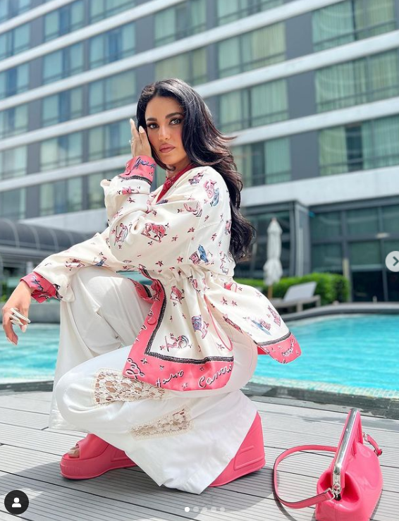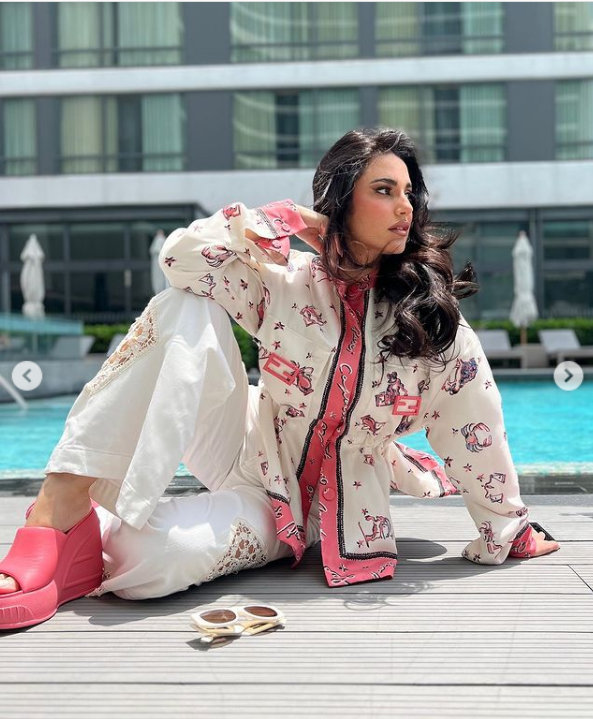 لفتت الفنانة درة زروق الأنظار بإطلالة "كاجوال" جذابة وانيقة، مرتدية بدلة تتكون من بنطال تضم عدة ألوان مختلفة منها "الأبيض والفوشيا"، تنتمي إلي قصة الأوفر سايز، مصمم من قماش بنقاشات مختلفة، أكملت اللوك بسليبر كعب عالي وشنطة فوشيا ونظارة شمسية، مما أبرز جمالها وقوامها الممشوق.