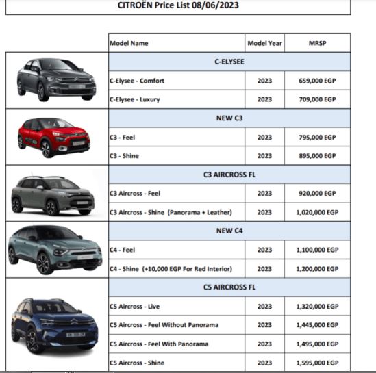 وفقاً لقائمة أسعار سيارات ستروين موديل 2023 الصادرة عن الشركة المصرية الأوروبية للسيارات فإن جميع الموديلات المطروحة في السوق المحلية شهدت زيادات سعرية جديدة.