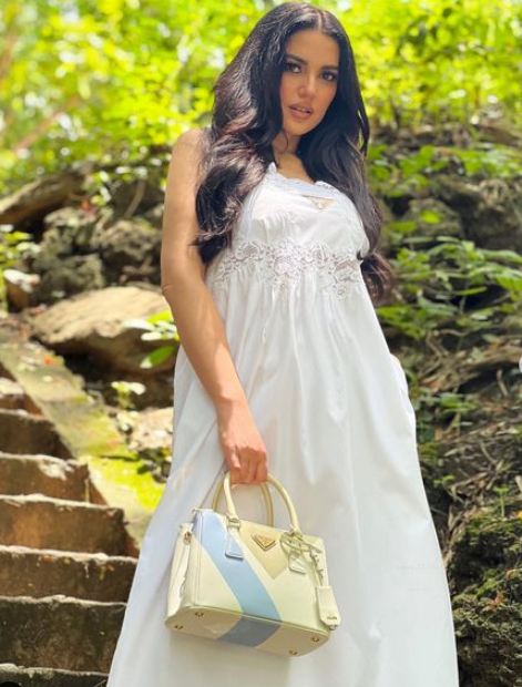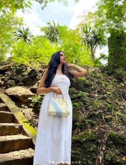 واختارت اللون الأبيض بتصميم الفستان البسيط لتنعم بلطف الطقس مع الطبيعة الخلابة حولها.