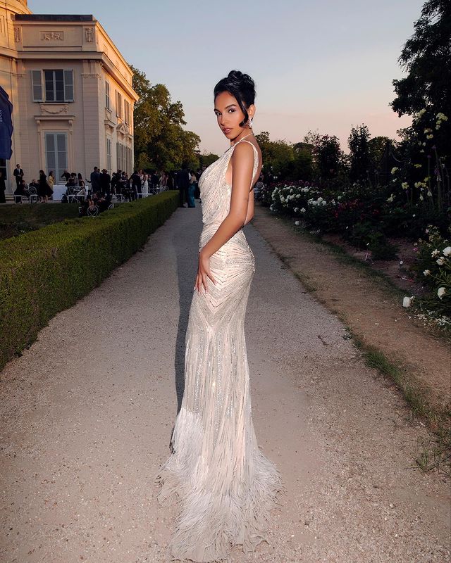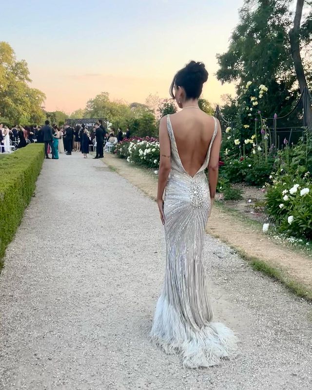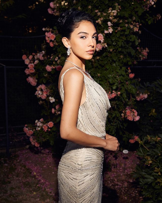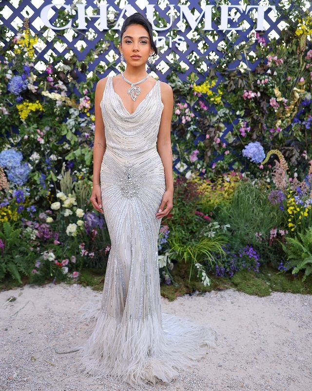 لفتت سلمي أبو ضيف الأنظار بإطلالة جذابة ومثيرة، مرتدية فستانا مجسما باللون "الأبيض" وينتمي الي قصة الv، بلا أكمام، مصمم من قماش لامع مرصع بحبات اللؤلؤ ومطرز بنقاشات مختلفة، اكملت اللوم ببعض الاكسسوارات الرقيقة، وتزينت بعقد من الألماس حول رقبتها، وحلق في أذنيها، مما أبرز جمالها وقوامها الممشوق.