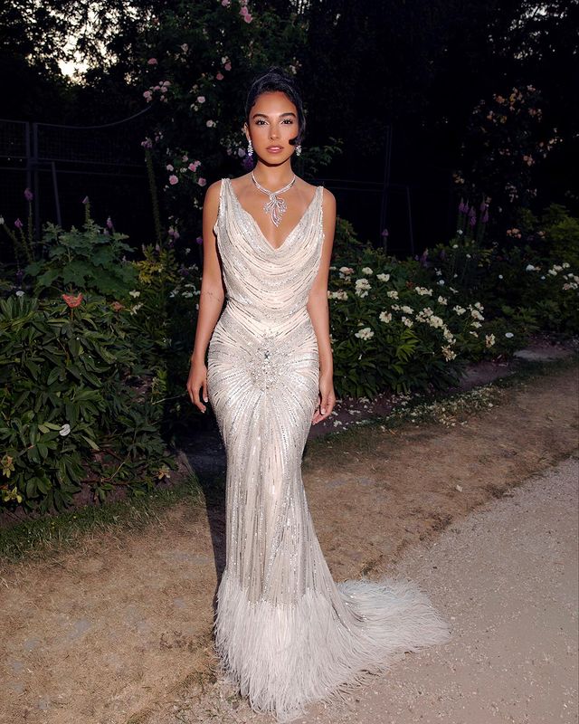 سلمي أبو ضيف تنافس عارضات الأزياء بالأبيض المرصع بالألماس (صور)