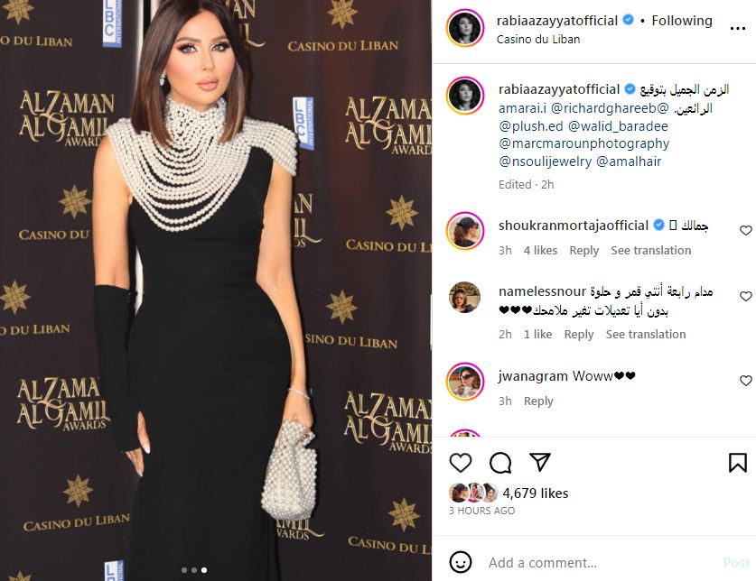 وتألقت رابعة الزيات بإطلالة ساحرة متزينة بحبات اللؤلؤ الأبيض، حيث ارتدت فستان طويل مجسم، بدون أكمام، صمم من قماش ناعم باللون الأسود، ليزيد من أناقة إطلالتها، وزين الفستان بجوانتي طويل، عكس الفستان قوامها الممشوق ووزنها المثالي.