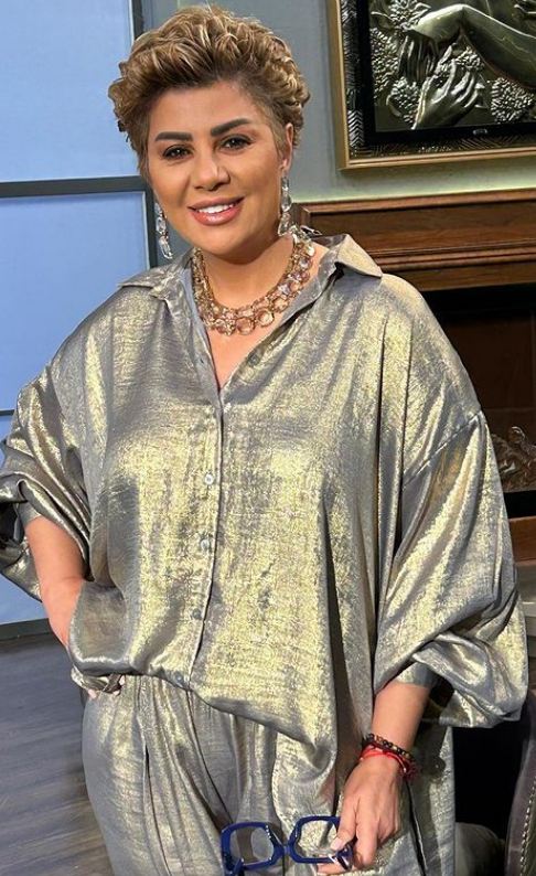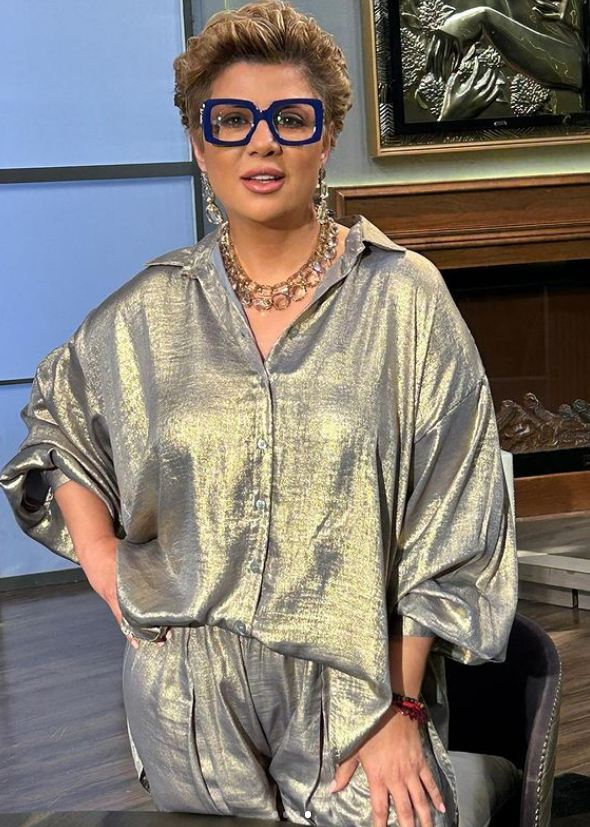 وظهرت مفيدة شيحة بإطلالة شبابية لامعه، حيث ارتدت جمبسوت ينتمى لقصة الأوفر سايز، صمم من قماش ناعم باللون الذهبي.
