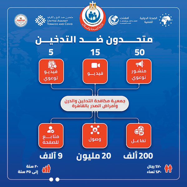 أعلنت وزارة الصحة والسكان نجاح الحملة التى أطلقتها مصر تحت شعار «متحدون ضد التدخين» فى الوصول إلى 20.1 مليون مستهدف من خلال وسائل التواصل الاجتماعي، بالإضافة إلى 8.5 مليون من خلال التلفزيون والراديو، وذلك فى مدة لا تزيد على 9 شهور.