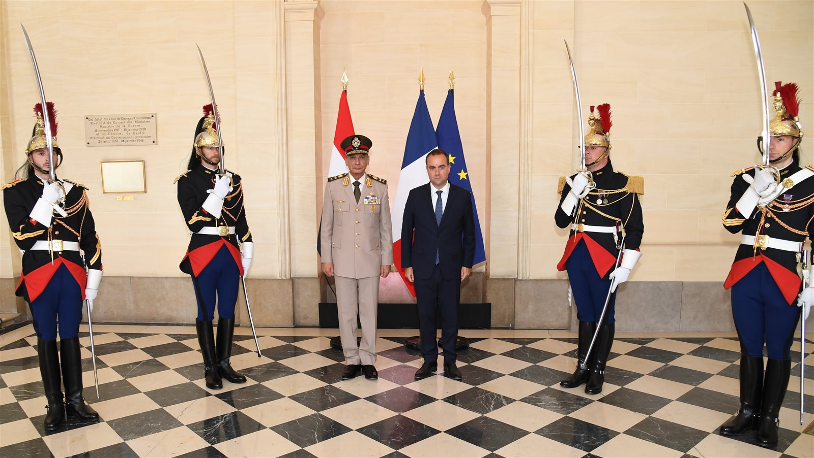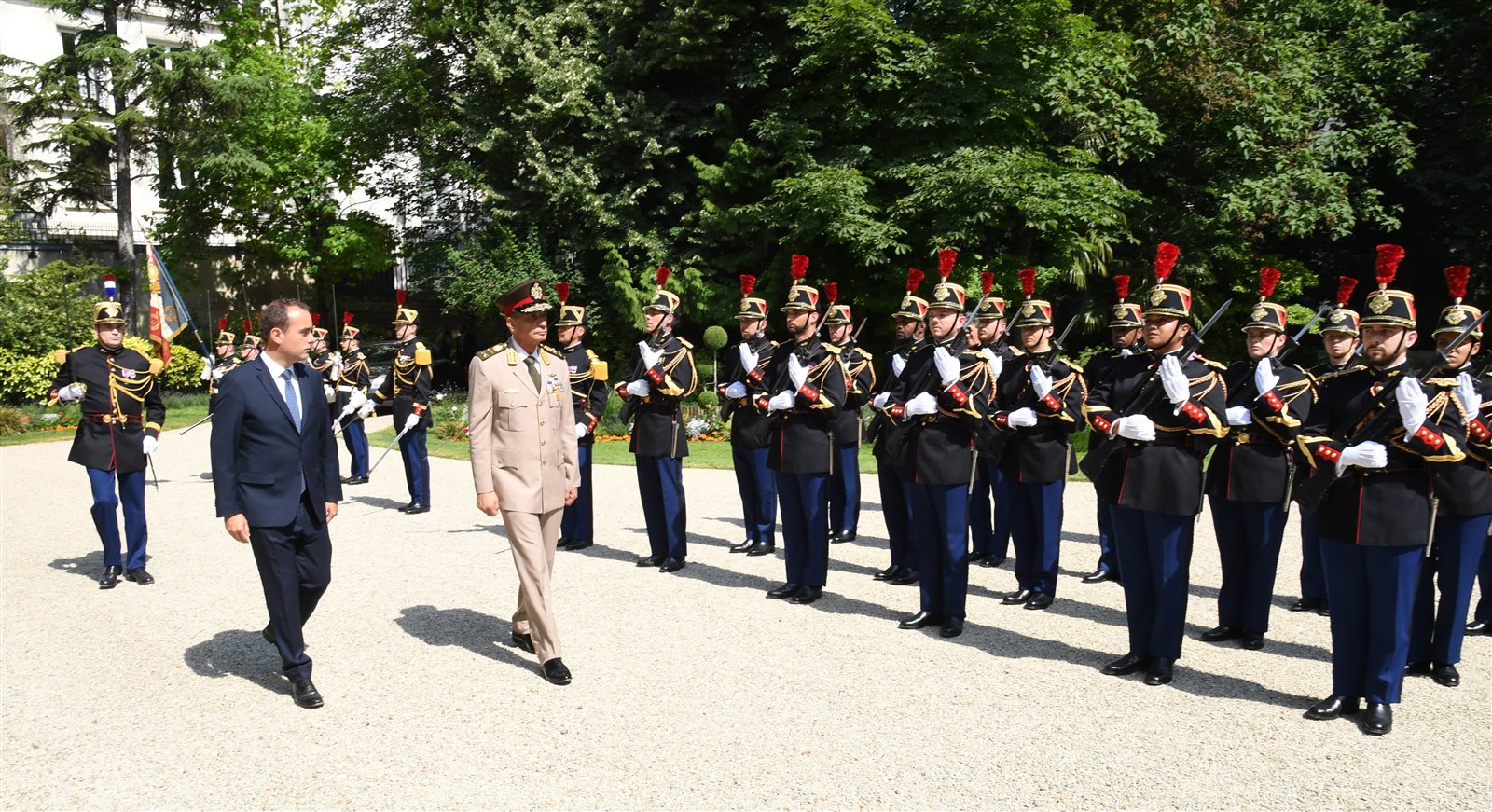 وكان فى إستقبال السيد القائد العام للقوات المسلحة لدى وصوله إلى مقر وزارة الدفاع الفرنسية السيد سيباستيان لوكورنو وزير الجيوش الفرنسية ، حيث أجريت مراسم الإستقبال الرسمية.