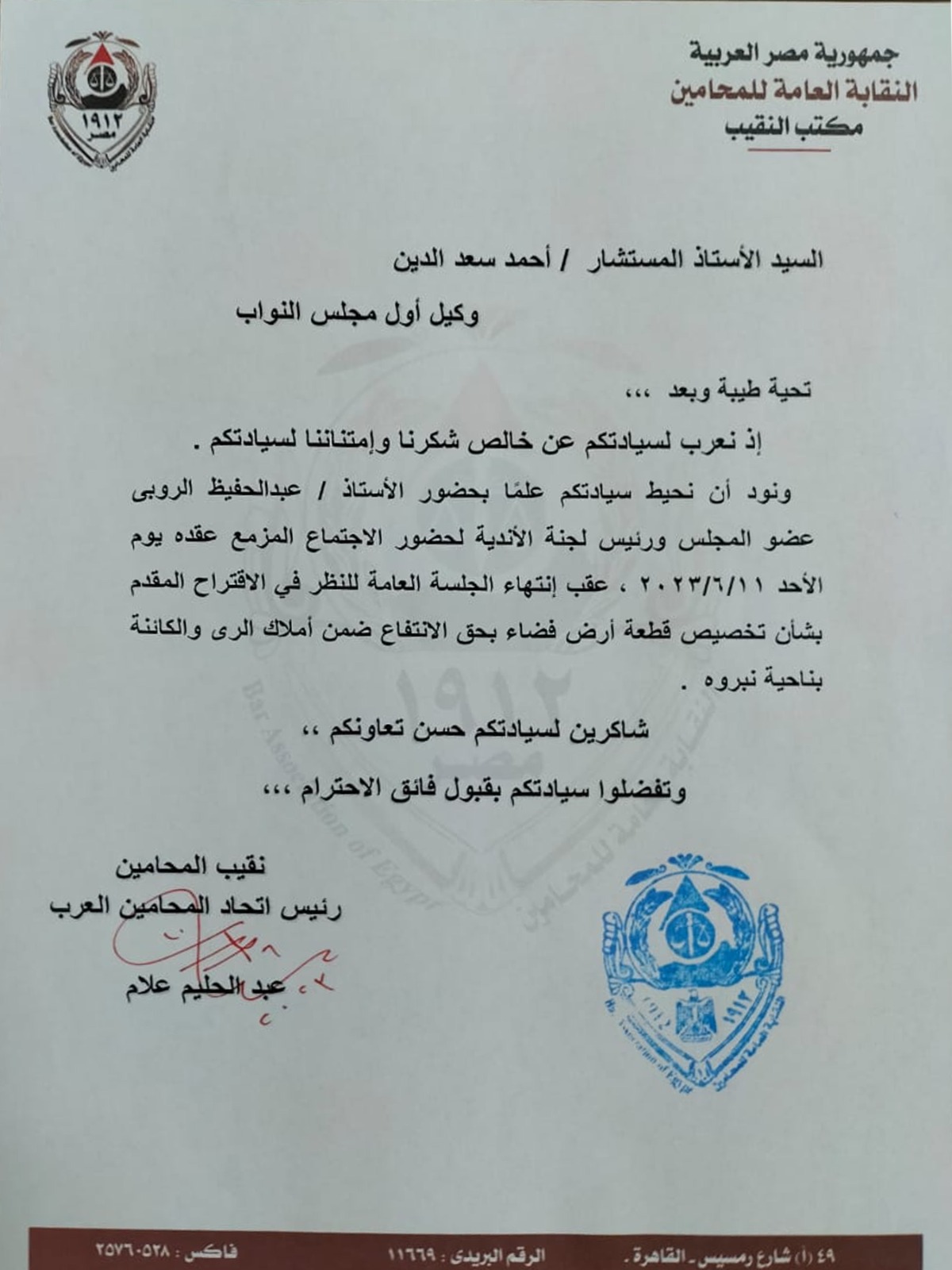 أوفد عبدالحليم علام نقيب المحامين، رئيس اتحاد المحامين العرب، أمس الأحد، عبدالحفيظ الروبي عضو مجلس النقابة العامة، رئيس لجنة الأندية، لحضور اجتماع لجنة الاقتراحات والشكاوى بمجلس النواب، وذلك لمناقشة اقتراح النقابة بشأن تخصيص أرض بحق الانتفاع لنقابةِ المحامين.