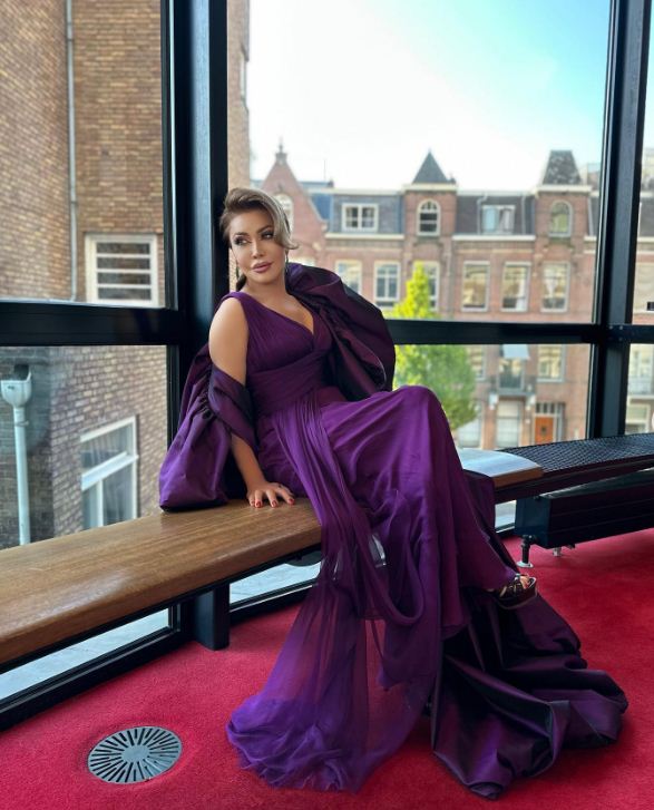 وبدت نوال الزغبي بفستان بنفسجي اللون مكشوف الأكتاف والصدر، وتميز بقماشته متعددة الطيات؛ لتبرز أنوثتها ونحافة خصرها، وأضافت لمسة أنيقة للفستان بإرتداء كارديجان طويل ذا أكمام منفوخة مصنوع من قماش الحرير وباللون البنفسجي.