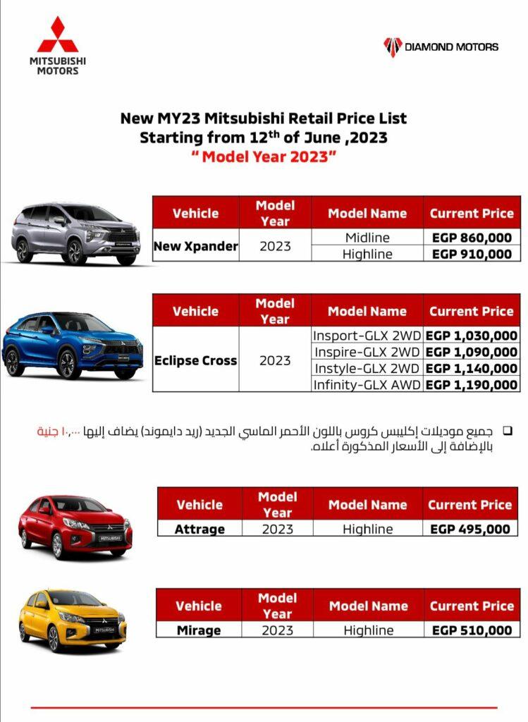 أخطرت شركة دايموند موتورز وكيل علامة ميتسوبيشي، شبكة موزعيها المعتمدين، بالقائمة الجديدة لأسعار سيارات ميتسوبيشي موديل 2023.