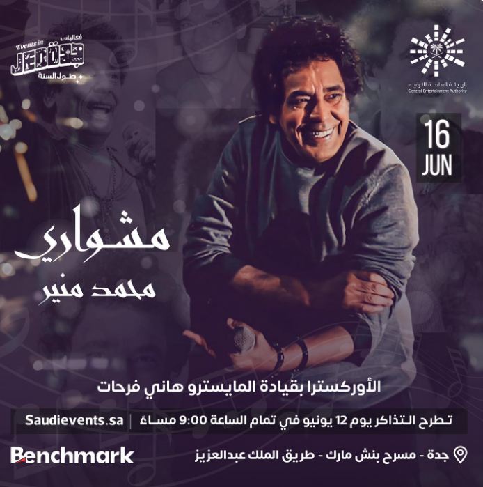 ومن المقرر أن يقام حفل الكينج محمد منير، يوم الجمعة 16 يونيو الجاري، في مدينة جدة وأطلق عليها ليلة “مشواري”، بقيادة موسيقية للمايسترو هاني فرحات.