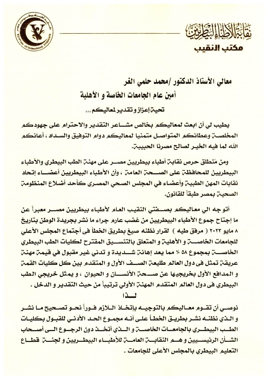 خاطب الدكتور خالد سليم، النقيب العام للأطباء البيطريين، نائب رئيس اتحاد نقابات المهن الطبية، كلا من: الدكتور أيمن عاشور وزير التعليم العالي والبحث العلمي، والدكتور محمد حلمى الغر، أمين عام الجامعات الخاصة والأهلية، وذلك لطلب إعادة النظر فيما نشر بأحد الجرائد، وتظنه النقابة نشر بطريق الخطأ، على أنه مجموع الحد الأدني للقبول بكليات الطب البيطري بالجامعات الخاصة.