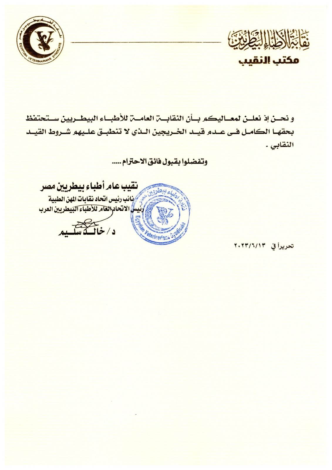 وطالب باتخاذ اللازم نحو تصحيح ما نشر، لافتا إلى أن القرار حال صحته فقد أتخذ دون الرجوع الى أصحاب الشأن الرئيسيين وهما: النقابة العامة للأطباء البيطريين، ولجنة قطاع التعليم البيطري بالمجلس الأعلى للجامعات، مؤكدا أن أن النقابة العامة للأطباء البيطريين تحتفظ بحقها الكامل فى عدم قيد الخريجين الذي لا تنطبق عليهم شروط القيد النقابى.