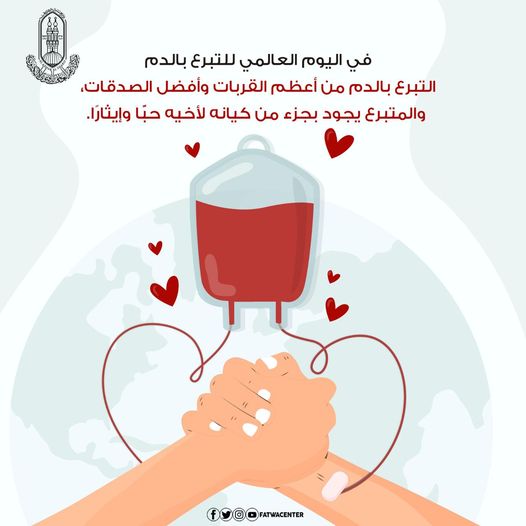 قال مركز الأزهر العالمي للفتوى الإلكترونية، إن التبرع بالدم من أعظم القربات وأفضل الصدقات؛ لما فيه من معنى إحياء النفس التي قال عنها الله تعالى: {وَمَنْ أَحْيَاهَا فَكَأَنَّمَا أَحْيَا النَّاسَ جَمِيعًا}، [المائدة:32].