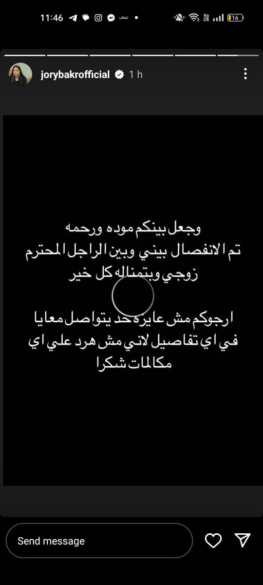 جوري بكر تعلن انفصالها عن زوجها عبر إنستجرام: تم الانفصال بيني وبين الراجل المحترم زوجي، ومش هرد على أي مكالمات