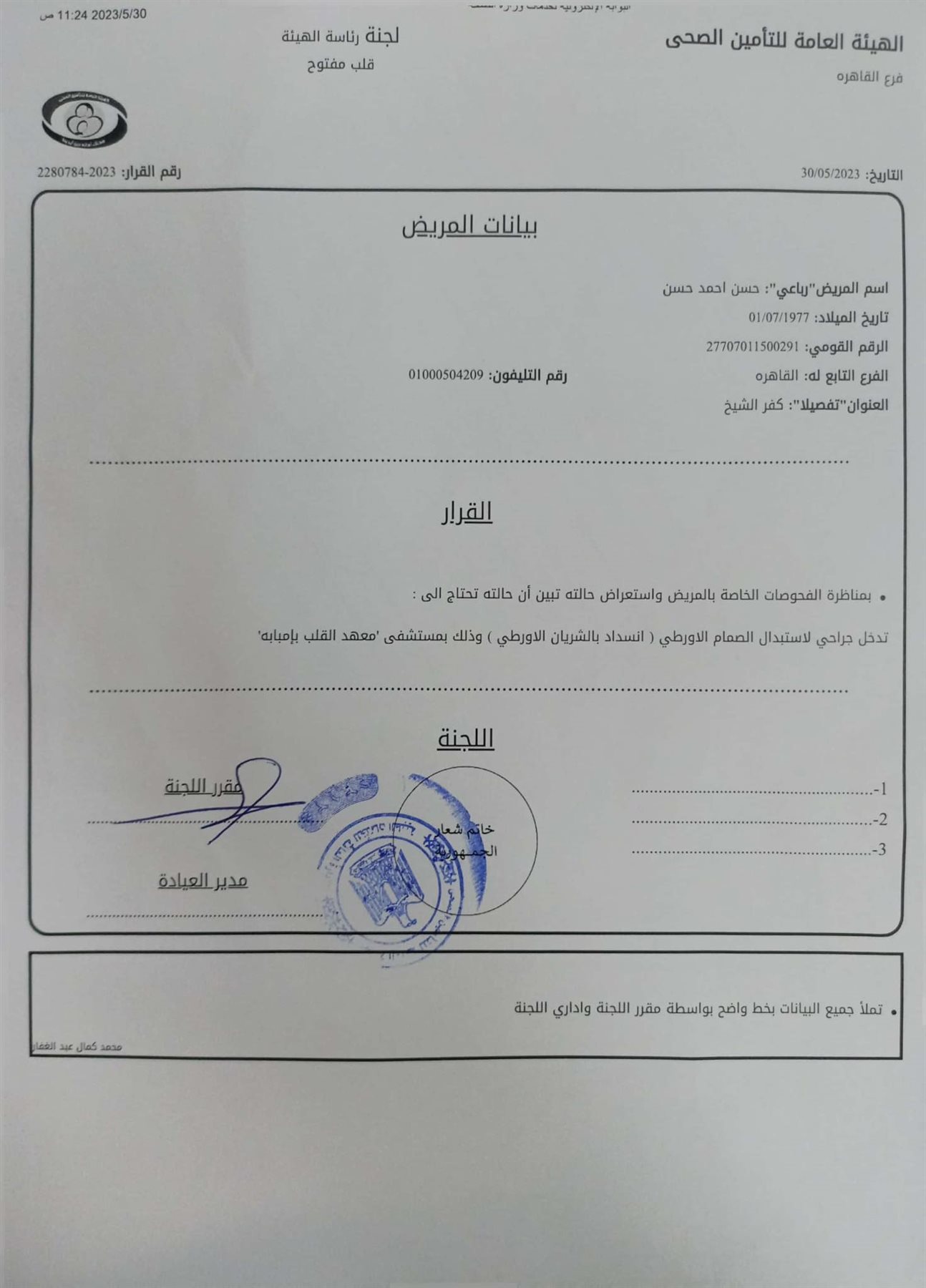 قال "حسن": تعرضت لأزمة قلبية منذ ٤ شهور وتم إجراء عملية تغيير ٢ صمام أورطي ولكن بعد ثلاث شهور فشل صمام وفي احتياج إلى تغييره.