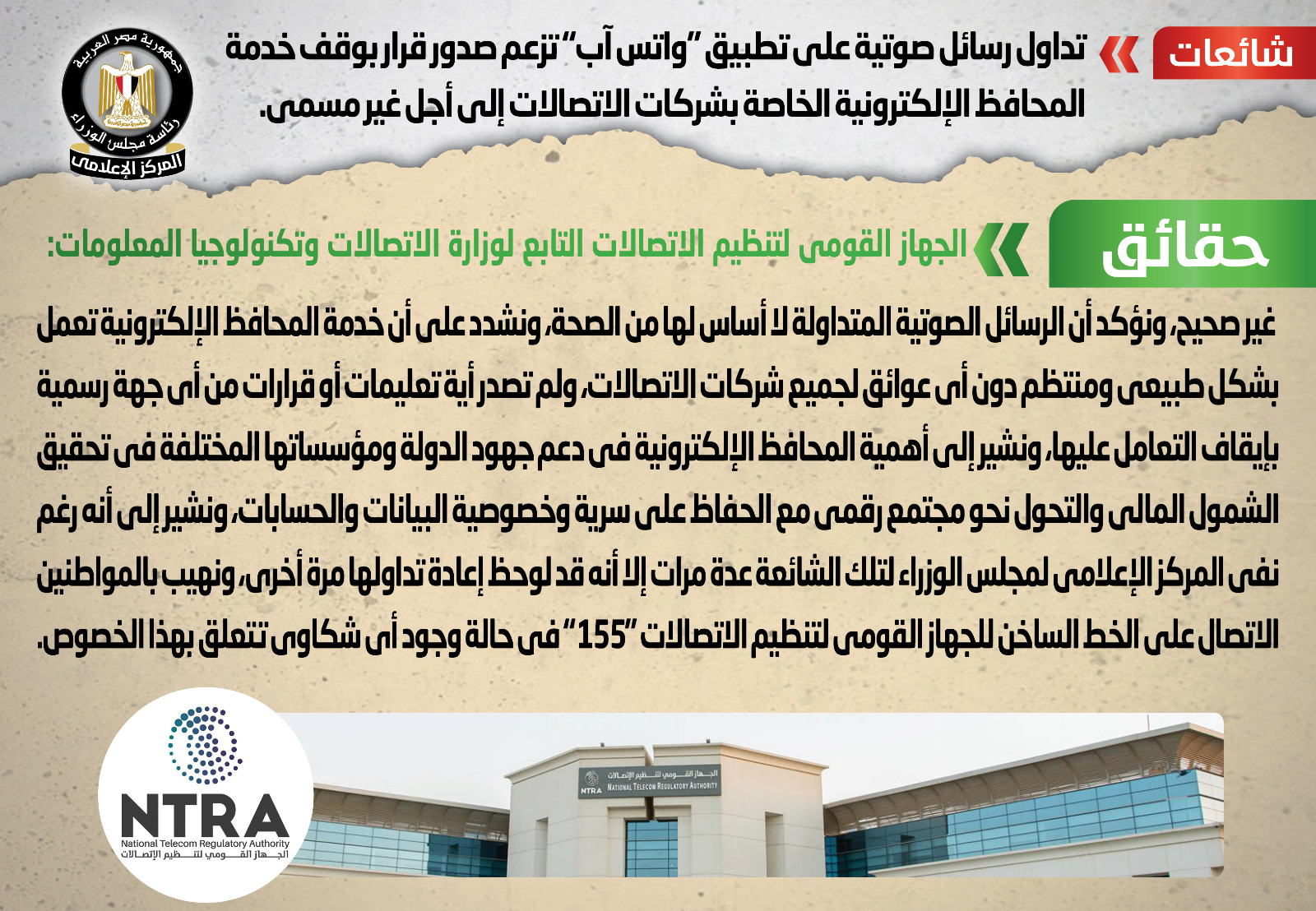 وأشار إلى أهمية المحافظ الإلكترونية في دعم جهود الدولة ومؤسساتها المختلفة في تحقيق الشمول المالي والتحول نحو مجتمع رقمي مع الحفاظ على سرية وخصوصية البيانات والحسابات، مُشيراً إلى أنه رغم نفي المركز الإعلامي لمجلس الوزراء لتلك الشائعة عدة مرات إلا أنه قد لوحظ إعادة تداولها مرة أخرى، مُهيباً بالمواطنين الاتصال على الخط الساخن للجهاز القومي لتنظيم الاتصالات "155" في حالة وجود أي شكاوى تتعلق بهذا الخصوص.