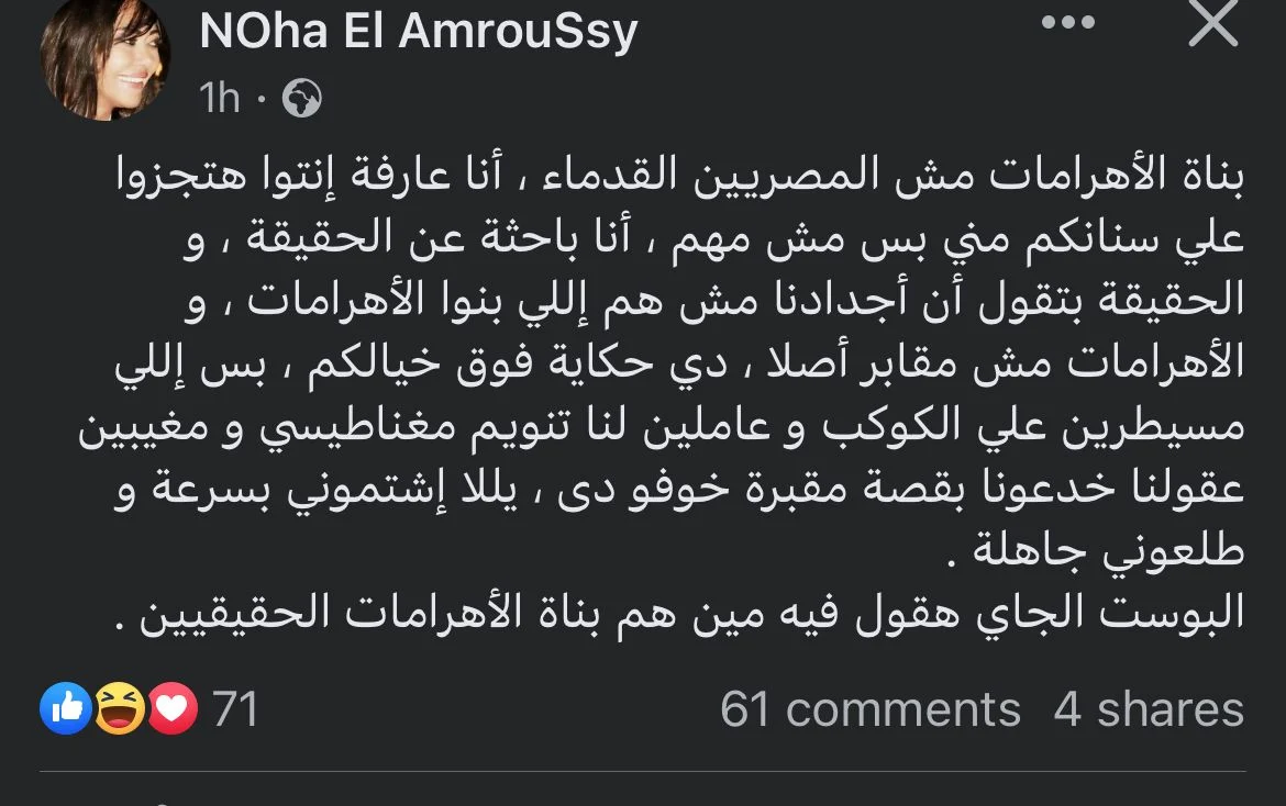 كتبت "العمروسي" منشورًا جديدًا عبر حسابها بموقع "فيسبوك"، والذي جاء به الآتي: "بناة الأهرامات مش المصريين القدماء، أنا عارفة أنتوا هتجزوا على سنانكم مني بس مش مهم، أنا باحثة عن الحقيقة، والحقيقة بتقول إن أجدادنا مش هم اللي بنوا الأهرامات، والأهرامات مش مقابر أصلًا، دي حكاية فوق خيالكم".