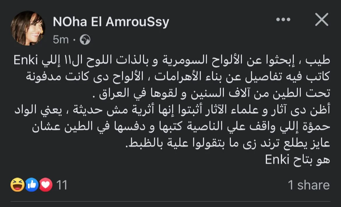 وتابعت نهى العمروسي: "طيب ابحثوا عن الألواح السومرية وبالذات اللوح الـ 11 اللي Enki كاتب فيه تفاصيل عن بناء الأهرامات، الألواح دي كانت مدفونة تحت الطين من آلاف السنين ولقوها في العراق".