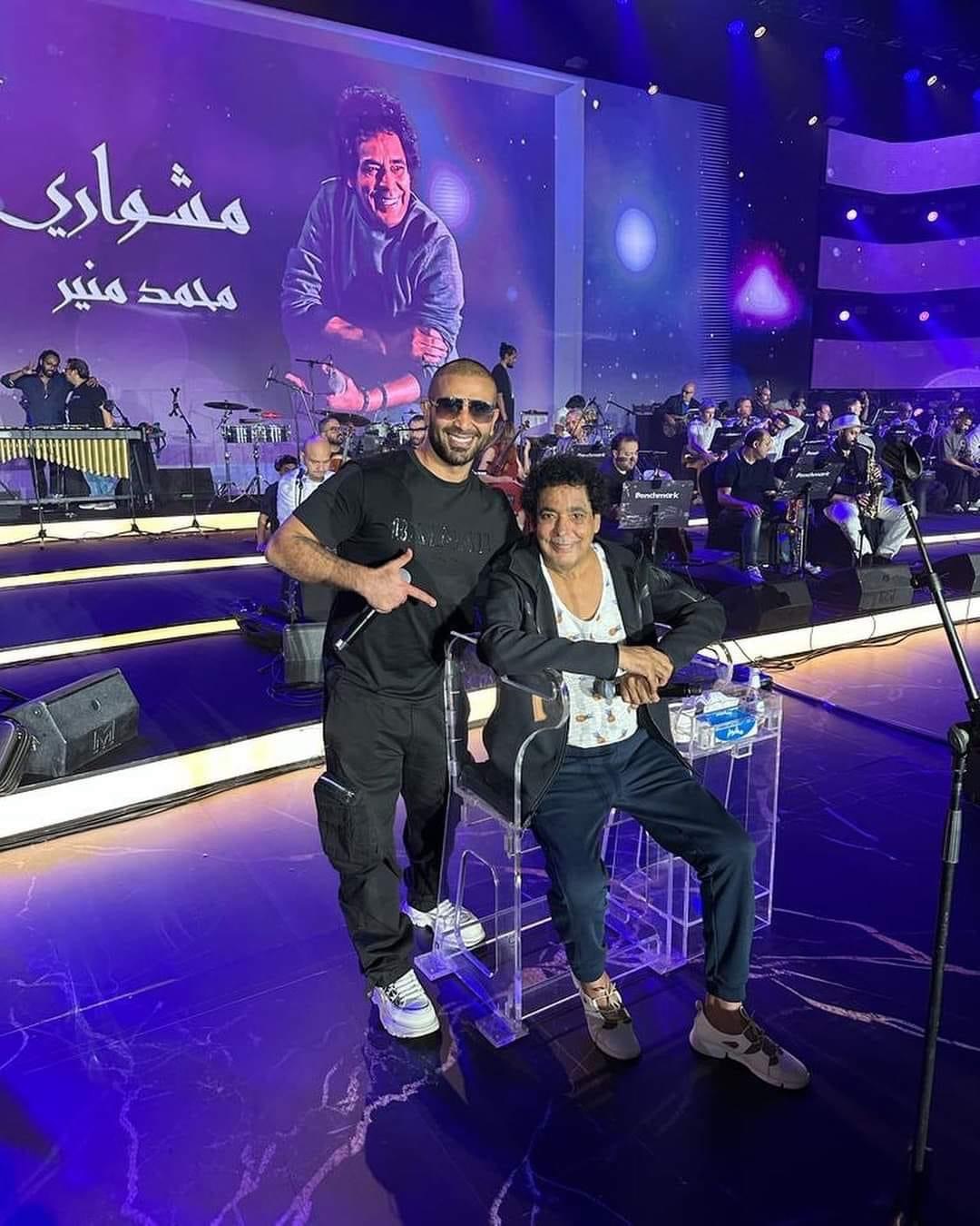 وتداول عدد من مستخدمي مواقع التواصل الاجتماعي، مجموعة صور للكينج محمد منير من بروفات حفله بجدة، والتي ظهر خلالها رفقة الفنان أحمد سعد.