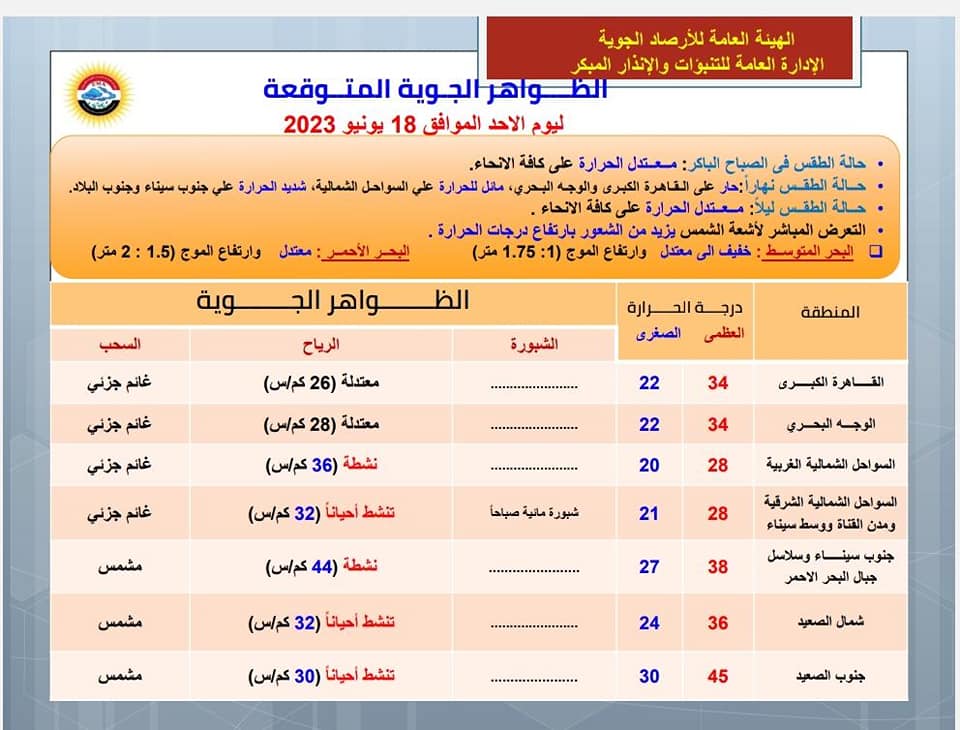 ومن المتوقع أن تسجل درجات الحرارة غدًا الأحد على القاهرة 34 درجة مئوية وتسجل محافظة الإسكندرية 28 درجة مئوية، فيما تصل محافظات جنوب الصعيد 45 درجة مئوية.