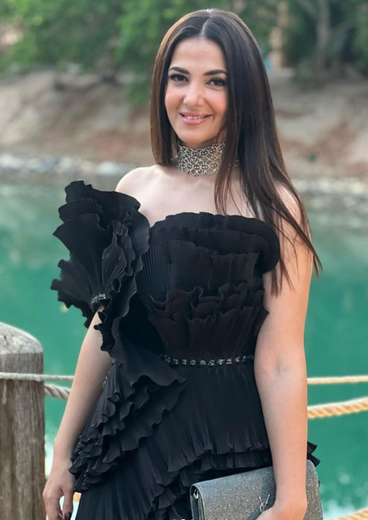 وتألقت دنيا سمير غانم بإطلالة ناعمة وجذابة، إذ ارتدت فستانًا قصيرًا ولافتًا باللون الأسود، من دون أكمام وينتمي لأحدث صيحات فساتين الكب، ومُزين بفصوص لامعة حول الخصر، فيما انتعلت حذاء لامعًا ذا كعب عال يمزج بين اللونين الأسود والفضي وحملت حقيبة يد سواريه "كلتش" بنفس الألوان، مما أبرز أنوثتها وقوامها الرشيق الممشوق.