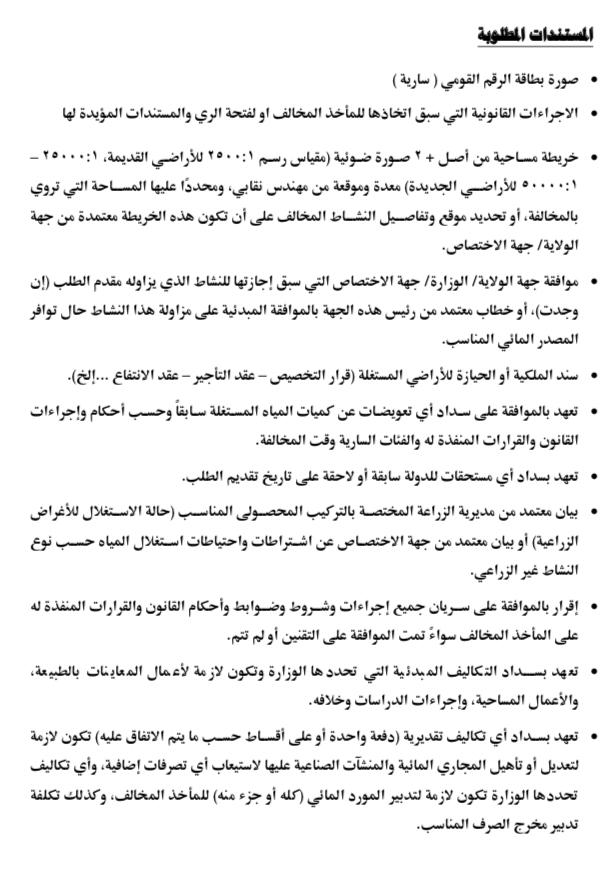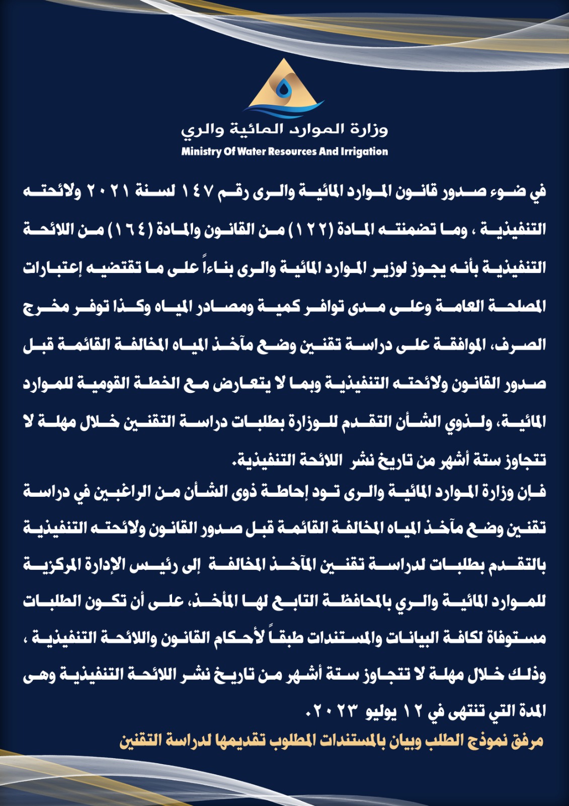 في ضوء صدور قانون الموارد المائية والرى رقم ١٤٧ لسنة ٢٠٢١ ولائحته التنفيذية، وما تضمنته المادة (١٢٢) من القانون والمادة (١٦٤) من اللائحة التنفيذية، بأنه يجوز لوزير الموارد المائية والرى بناء على ما تقتضيه اعتبارات المصلحة العامة، وعلى مدى توافر كمية ومصادر المياه وكذا توفر مخرج الصرف، الموافقة على دراسة تقنين وضع مآخذ المياه المخالفة القائمة قبل صدور القانون ولائحته التنفيذية وبما لا يتعارض مع الخطة القومية للموارد المائية، ولذوي الشأن التقدم للوزارة بطلبات دراسة التقنين خلال مهلة لا تتجاوز ستة أشهر من تاريخ نشر اللائحة التنفيذية.