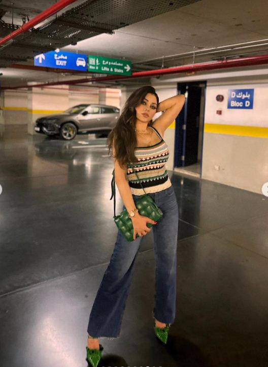 ونسقت مع ملابسها حذاء ذا كعب عالٍ باللون الأخضر، وحقيبة كروس نفس اللون، وتزينت بمجموعة من الإكسسوارات المميزة، فضمت العديد من السلاسل الذهبية متعددة الطول، وخاتمين، أحدهما مطرز بالفصوص الملونة بالفوشيا والأخضر.
