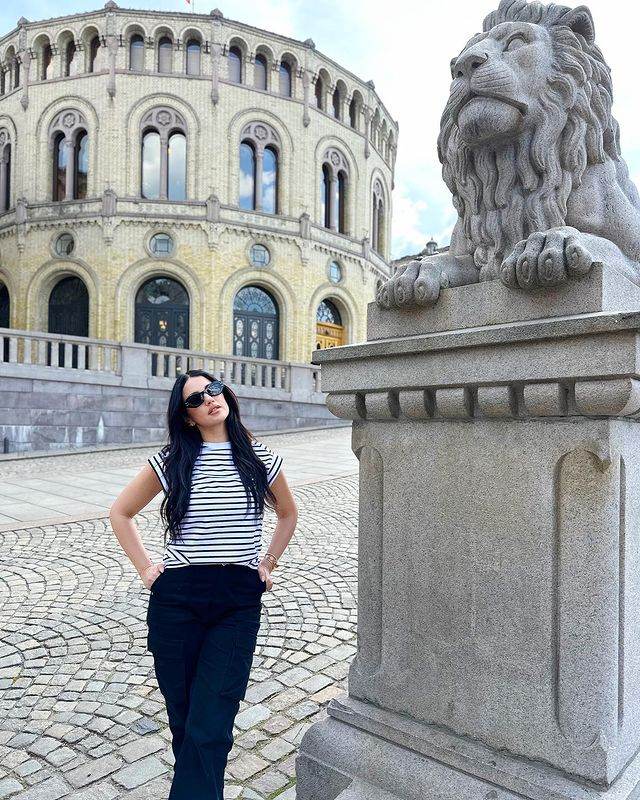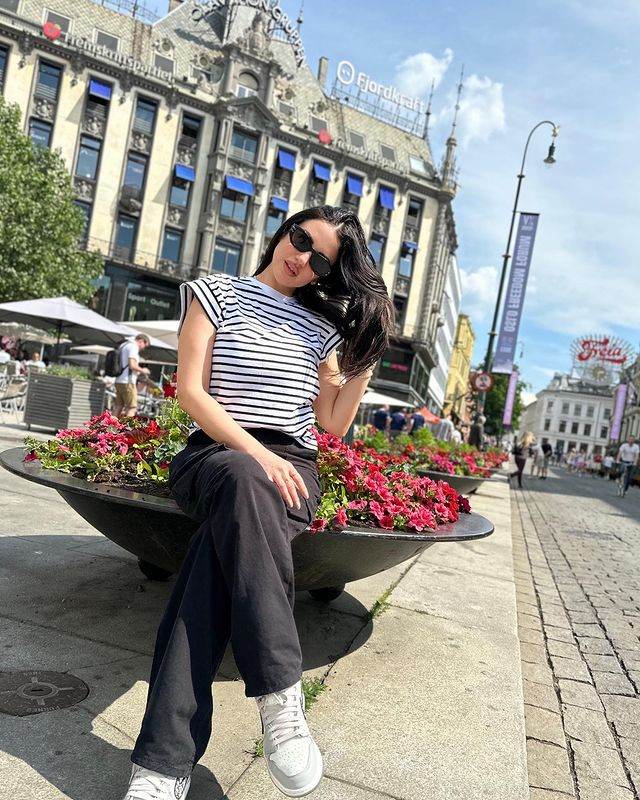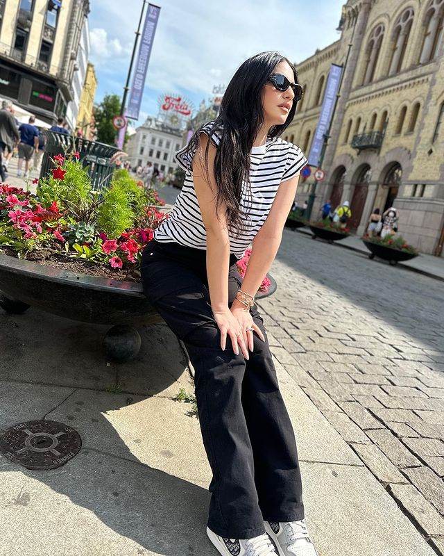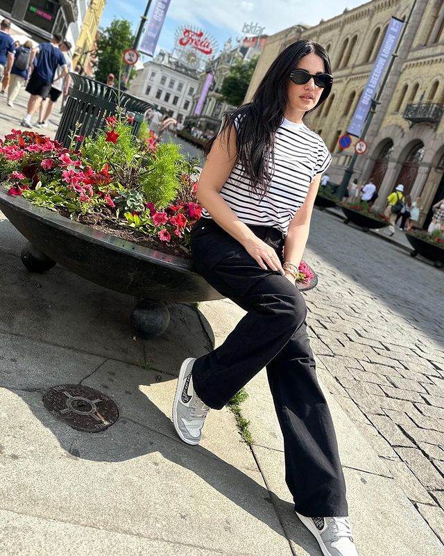 لفتت الفنانة درة زروق الأنظار بإطلالة "كاجوال" جذابة وأنيقة، مرتدية بنطال اللون "الأسود"، ونسقت معه بلوز تمزج بين اللون الأبيض والأسود، مصمم من قماش بنقاشات مختلفة، أكملت اللوك بنظارة شمسية وحذاء أبيض، مما أبرز جمالها وقوامها الممشوق.