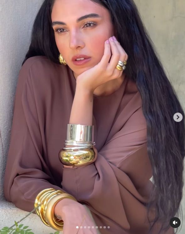 وبدت سلمى بفستان بني فضفاض مصنوع من الشيفون الناعم، ومُزين بوشاح طويل مثبت على أحد الجانبين، مما أبرز أناقتها وجمالها.