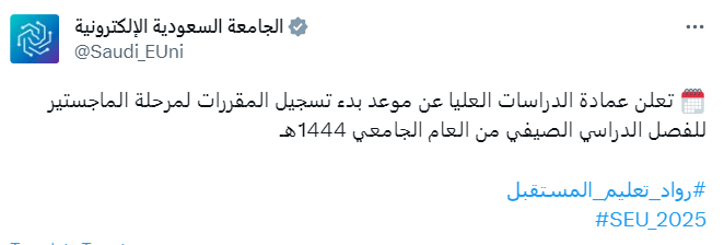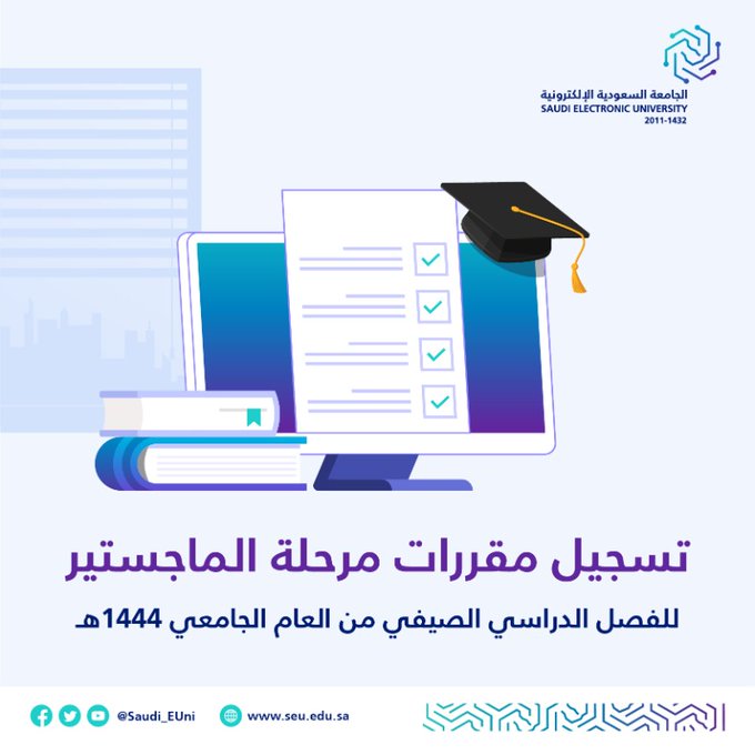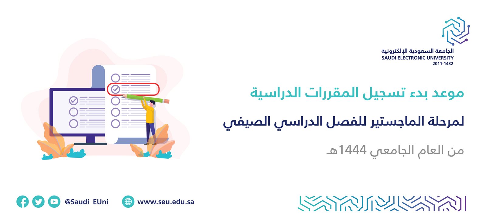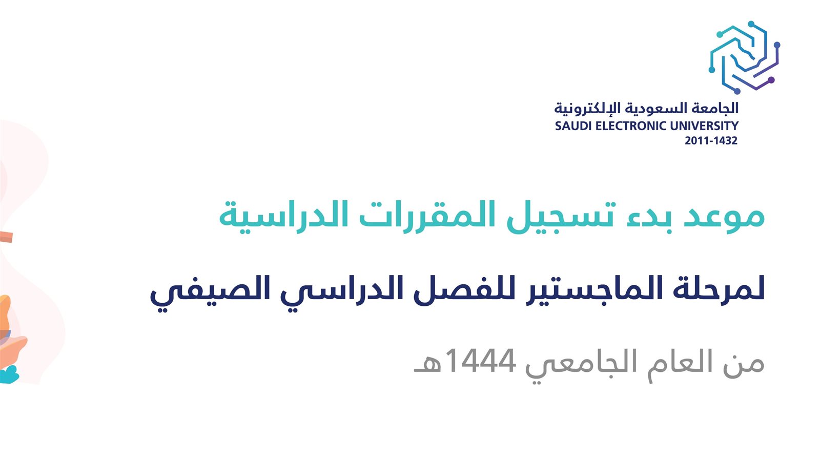 كما أعلنت مواعيد هامة متعلقة بتسجيل المقررات لمرحلة الماجستير للفصل الدراسي الصيفي، بالجامعة السعودية الإلكترونية وهي: