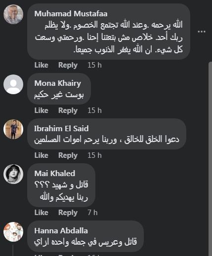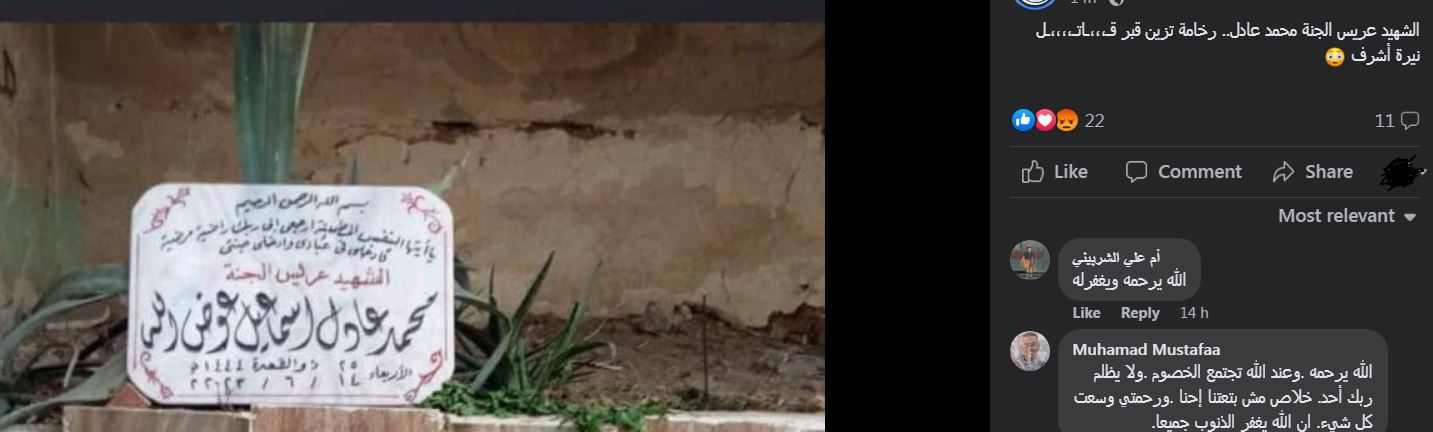 وفي السياق ذاته، انقسمت آراء رواد السوشيال ميديا بين مؤيد ومعارض، لوضع اللوحة الرخامية على قبر محمد عادل ووصفه بالشهيد، فكانت أبرز التعليقات: "قاتل وعريس في جمله واحده ازاي .. قاتل و شهيد ؟؟؟ ربنا يهديكم والله .. دعوا الخلق للخالق ، وربنا يرحم اموات المسلمين .. الله يرحمه .وعند الله تجتمع الخصوم .ولا يظلم ربك أحد. خلاص مش بتعتنا إحنا .ورحمتي وسعت كل شيء. ان الله يغفر الذنوب جميعا .. مش فاهم عريس الجنه من انهي اتجاه .. اهو كله مكتوب ف الدنيا العلم عند الله مكتوب ايه فوق".