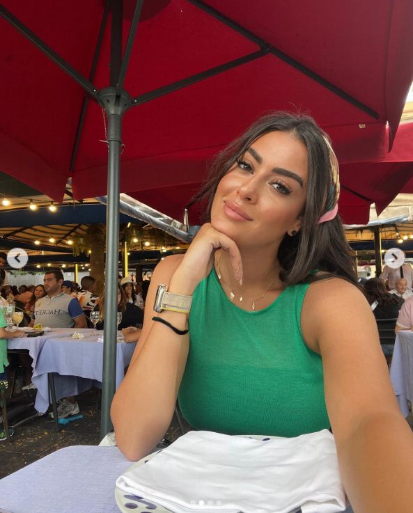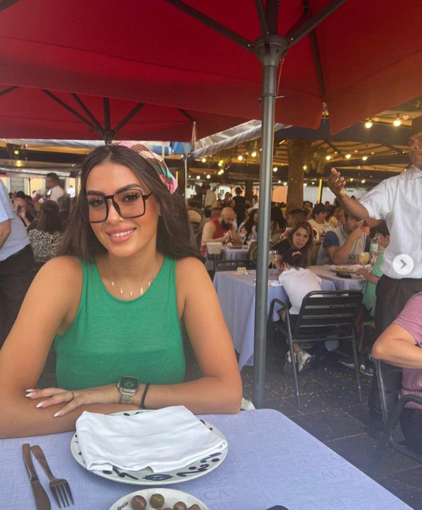 وبدت ميرنا نور الدين بإطلالة كاجوال أنيقة، فارتدت توب كت باللون الأخضر، وتزينت بإكسسوارات رقيقة تضمت سلسلة ذهبية رفيعة، وساعة باللون الفضي، بالإضافة لنظارة شمسية كبيرة الحجم.
