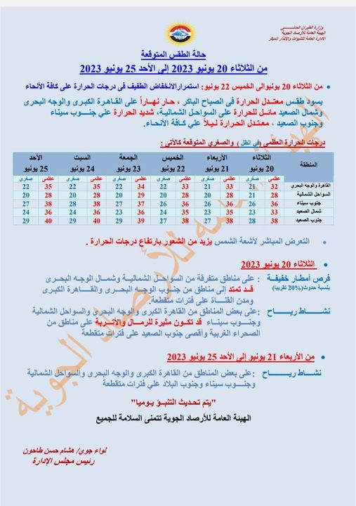 كشفت الهيئة العامة للأرصاد الجوية عن توقعاتها لحالة الطقس غدًا الثلاثاء، موضحة أن هناك انخفاض طفيف فى درجات الحرارة على كل الأنحاء، ليسود طقس معتدل الحرارة فى الصباح الباكر على كافة الأنحاء، حار نهارا على القاهرة الكبرى والوجه البحرى وجنوب سيناء وشمال الصعيد، مائل للحرارة على السواحل الشمالية، شديد الحرارة على جنوب الصعيد  ،  معتدل ليلا على كافة الأنحاء.